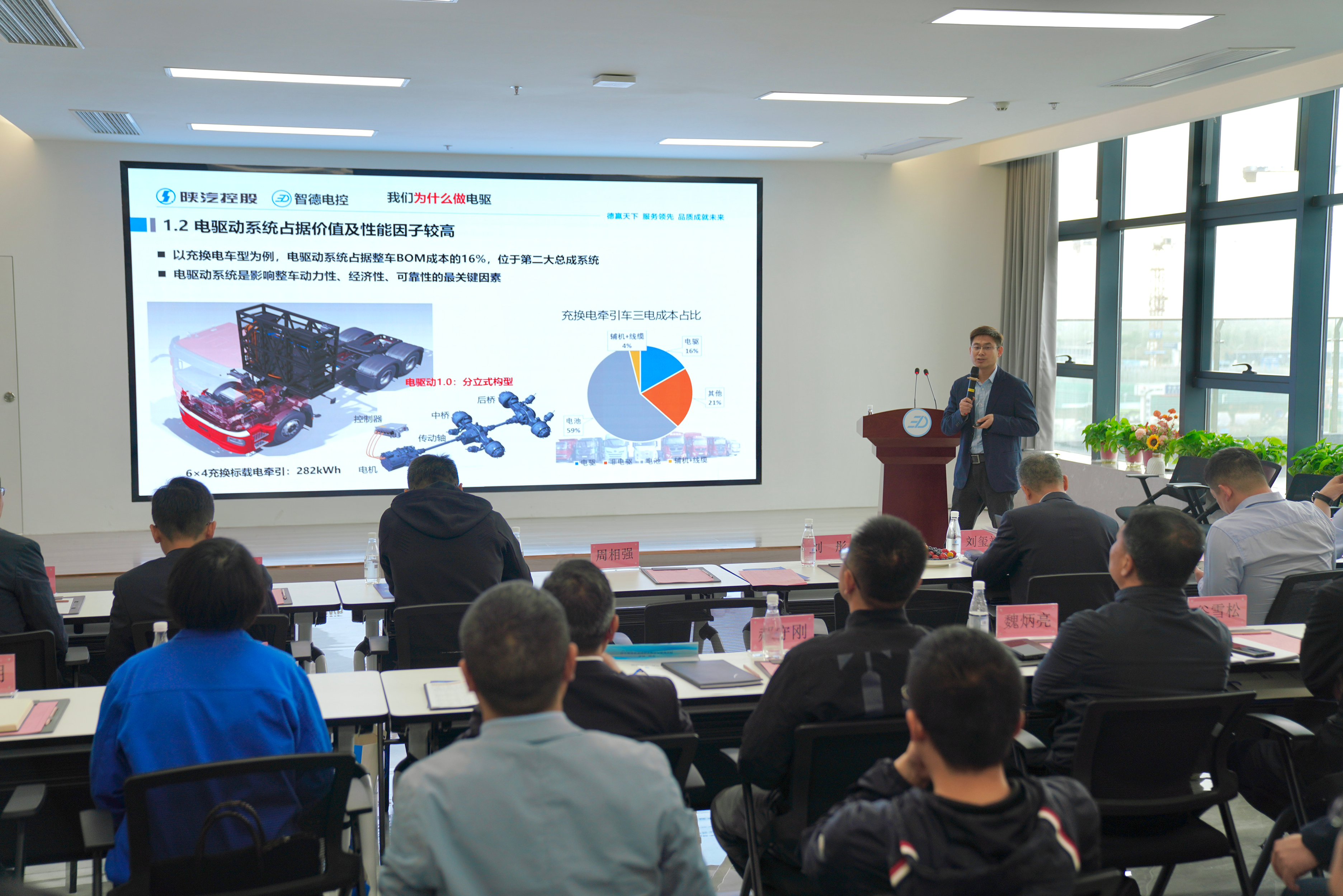 陜重汽研究院技術(shù)專家鄧家奇對目前商用車電驅(qū)動系統(tǒng)發(fā)展趨勢作特別演講,重點(diǎn)指出整車對驅(qū)動系統(tǒng)的需求,并與智德電控共商發(fā)展需求,共譜協(xié)同建議。